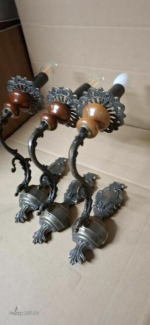 Kinkiety wykonane z masywnego mosiądzu. Pięknie się zestarzały - klimat vintage. Stan jak na zdjẹciach. Cena za 3 szt.