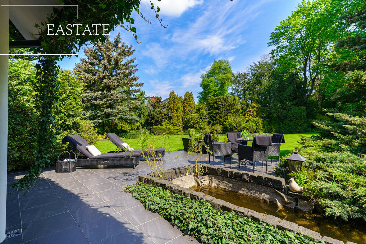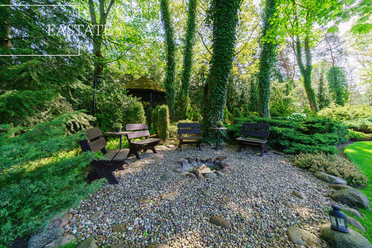 Za domem piękny, zadbany ogród z licznymi nasadzeniami oraz miejscem do wypoczynku i spędzania wolnego czasu.
