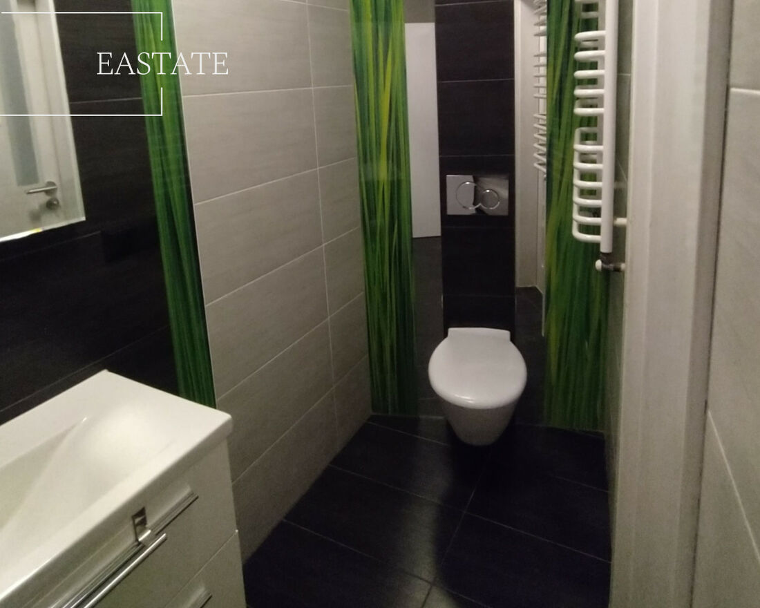 -Łazienka: wanna z panelem prysznicowym, szklany parawan, toaleta podwieszana, umywalka