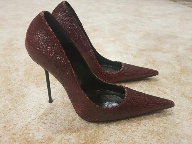 Piękne i nowe eleganckie szpilki z odkrytymi palcami, rozmiar 38, na srebrnej podeszwie wys. 1,5 cm oraz obcasem wys. 11 cm. ...