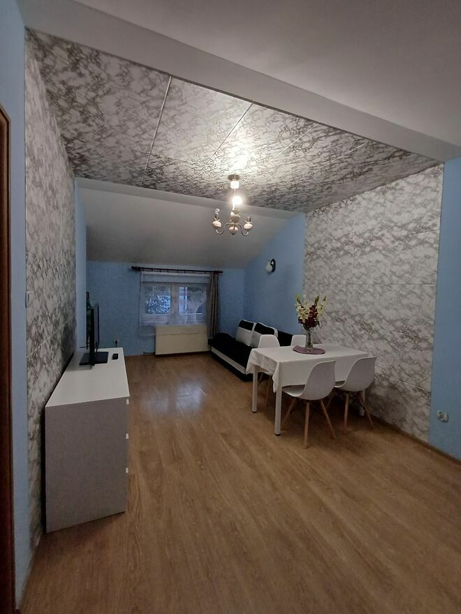 Pokój jest świeżo po remoncie z nowymi meblami.