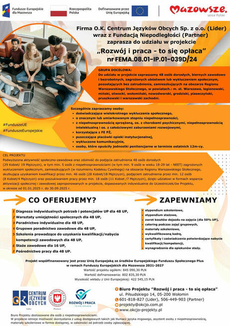 O. K. Centrum Języków Obcych Sp. z o. o. wraz z Fundacją Niepodległości prowadzi rekrutację do projektu pn. „Rozwój ...