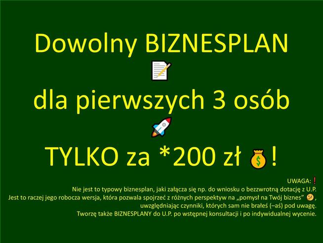Dowolny BIZNESPLAN - dla pierwszych 3 osób TYLKO za *300 zł ! *dotyczy prostych przedsięwzięć do 50 tys. ...